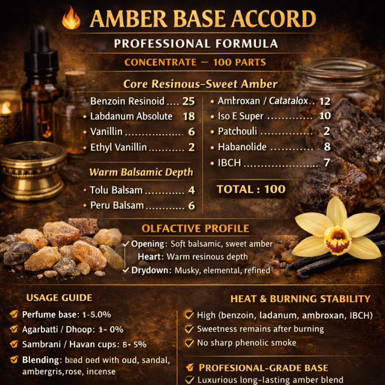 AMBER BASE ACCORD Here is a true professional Amber Base Accord formula (industry-standard style), clean, rich, long-lasting, suitable for perfume, agarbatti, dhoop, sambrani, and heat applications. OLFACTIVE PROFILE Opening: Soft sweet balsamic Heart: Warm resinous amber Drydown: Creamy, musky, woody,…